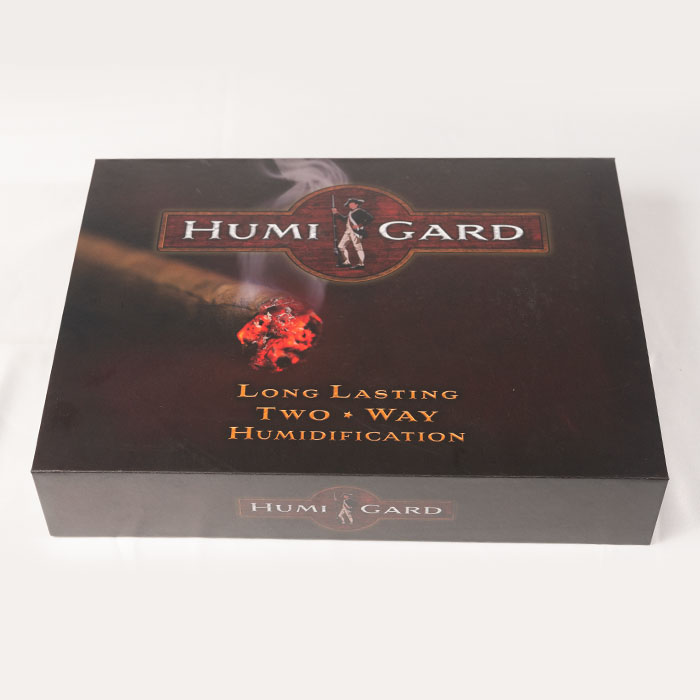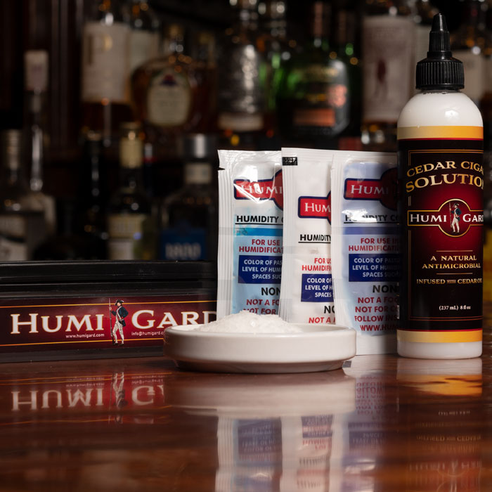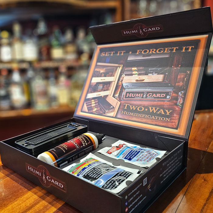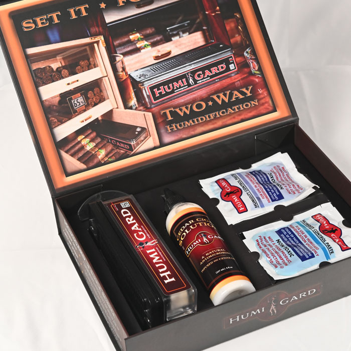 Everything you need to keep your cigars at the perfect humidity! It comes in a decorative gift box. Includes one HUMIGARD humidification unit, 8oz Cedar Cigar Solution, and Assortment pack of Humidity control paste.